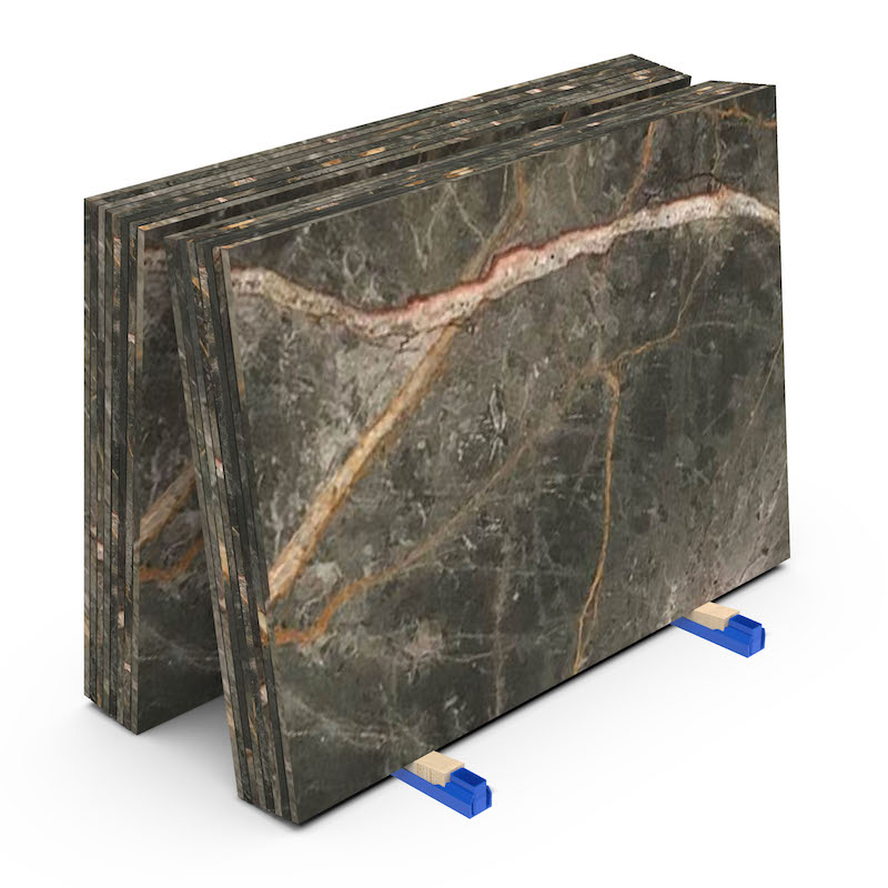 A字石材存放架的底座有保護木材,立柱表面也有橡膠緩沖材料,可以保護石板表面不受損壞;前端設(shè)有安全柱,以防石板脫落砸傷人員